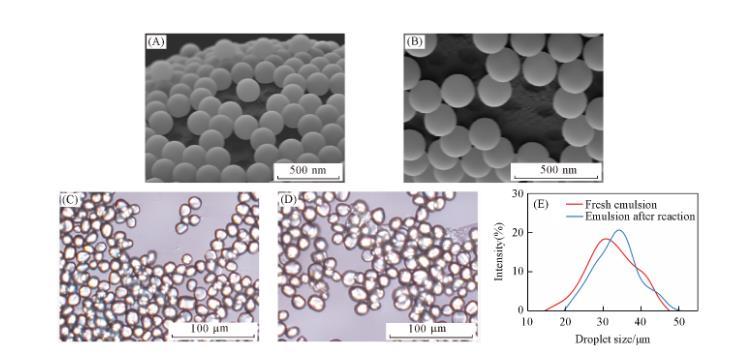 利用Pickering乳液進(jìn)行選擇性修飾是一種比較常用的Janus顆粒制備方法。由于裸露的SiO?顆粒偏親水,在Pickering乳液液滴表面的SiO?顆粒僅包裹了少量石蠟[圖1(A)和(B)]。這為使用一種Pickering乳液制備兩種具有不同氟碳鏈與碳?xì)滏湼采w面積比例的Janus顆粒提供了可能。