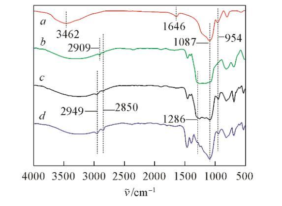 圖2為SiO?顆粒改性前后的紅外光譜圖。在裸露的SiO?顆粒(圖2譜線a)上,3459 cm?1處出現(xiàn)羥基的氫氧鍵伸縮振動(dòng)吸收峰,1646 cm?1處是納米SiO?表面吸附水的氫氧鍵振動(dòng)吸收峰,而在改性的顆粒上這2處吸收峰強(qiáng)度有所降低甚至消失,這是由于SiO?顆粒表面的硅羥基(Si—OH)與硅烷偶聯(lián)劑發(fā)生縮合反應(yīng)而數(shù)量減少,并且改變了顆粒表面與水之間氫鍵的鍵合密度;在圖2譜線b~d中,2949處和2850 cm?1處的吸收峰可分別歸屬為甲基和亞甲基上的碳?xì)滏I伸縮振動(dòng);并且這些吸收峰強(qiáng)度增加,說(shuō)明甲基和亞甲基數(shù)量增加。在1170~1286 cm?1間的峰為—CF?、—CF?的伸縮振動(dòng)峰,由于—CF?、—CF?的伸縮振動(dòng)峰與1087~1200 cm?1間的硅氧鍵伸縮振動(dòng)吸收峰重合,從而導(dǎo)致圖2譜線b~d中1087~1286 cm?1間的吸收峰變寬,并且吸收峰強(qiáng)度依次減弱,說(shuō)明—CF?、—CF?數(shù)量減少。綜上所述,可初步說(shuō)明納米SiO?表面被不同比例的碳?xì)滏満头兼湼采w。