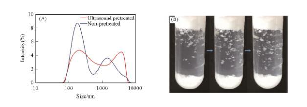 值得注意的是,如果粒子首先用超聲波分散在液體中,然后以相同的方式振蕩,則顆粒產(chǎn)生的泡沫高度有所下降[圖6(A)]。因此對(duì)比了振蕩和超聲波處理后的顆粒在液體中團(tuán)聚體的粒徑大小。采用動(dòng)態(tài)光散射儀間接表征了顆粒在液體中的團(tuán)聚情況[圖7(A)]。可以看出,振蕩后的液體中有較多物質(zhì)的粒徑大于單個(gè)顆粒直徑,而且粒徑分布很寬。這證明液體中存在明顯的顆粒團(tuán)聚體。由于顆粒本身存在巨大的表面能,多數(shù)顆粒在空氣中已經(jīng)自發(fā)團(tuán)聚。顆粒在液體中大多也以團(tuán)聚體的方式存在。少量空氣被密封在浸沒(méi)于油相中的顆粒團(tuán)聚體內(nèi)部,這部分不與外界聯(lián)通的空氣提供了額外的壓力,進(jìn)而阻止了進(jìn)一步滲透。這種顆粒團(tuán)聚體表面同樣形成了由Cassie-Baxter方程描述的復(fù)合表面,該復(fù)合表面的形成保護(hù)了構(gòu)成團(tuán)聚體的顆粒不被完全潤(rùn)濕,并使團(tuán)聚體表面具有合理的疏油性(cosθ_CB的值接近0),從而在熱力學(xué)上團(tuán)聚體便于發(fā)生吸附。而溶液經(jīng)超聲波處理后顆粒被潤(rùn)濕,團(tuán)聚體被破壞使尺寸變小,并且均勻分布在溶液中。圖6(B)顯示了在經(jīng)超聲波處理后的表面張力測(cè)試數(shù)據(jù),同樣表明團(tuán)聚體被破壞后,被潤(rùn)濕的顆粒不再傾向于吸附在表面上。