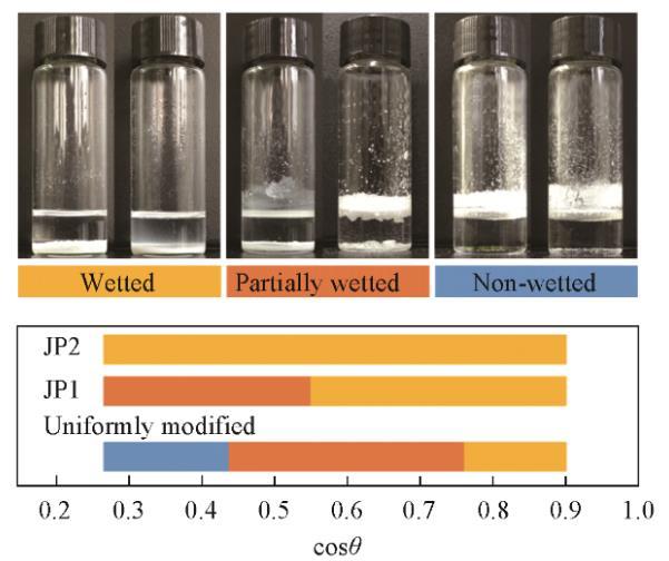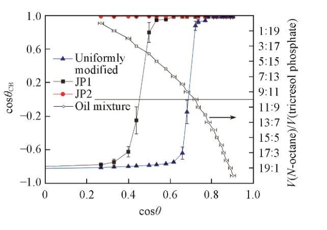 放置在靜止液體表面的顆粒的潤(rùn)濕行為由圖5示出。隨著液體表面張力的增加,從光滑的氟碳鏈覆蓋的表面獲得的cosθ值同時(shí)增大,液體頂部的表面出現(xiàn)明顯的不溶顆粒。這種顆粒不潤(rùn)濕的情況與顆粒形成粗糙表面測(cè)量的結(jié)果具有相關(guān)性。干燥的顆粒以蓬松狀態(tài)直接向油相傾倒,如果在油相表面能形成足夠強(qiáng)壯的、由顆粒組成的亞穩(wěn)態(tài)Cassie-Baxter狀態(tài),那么疏油表面將會(huì)形成,并阻止其它顆粒接觸油相,宏觀表現(xiàn)為顆粒不潤(rùn)濕。相反,如果油相表面由顆粒組成的亞穩(wěn)態(tài)Cassie-Baxter狀態(tài)魯棒性不足,在手動(dòng)振蕩或重力作用下,顆粒或顆粒團(tuán)聚體接觸油相并浸沒(méi)在油相中。亞穩(wěn)態(tài)魯棒性與顆粒表面材料潤(rùn)濕角密切相關(guān),即不同類型的顆粒具有明顯不同的潤(rùn)濕轉(zhuǎn)折點(diǎn)。JP1潤(rùn)濕性轉(zhuǎn)折點(diǎn)位于均勻修飾顆粒右側(cè),JP2沒(méi)有發(fā)現(xiàn)潤(rùn)濕轉(zhuǎn)折點(diǎn)。這與顆粒上接枝的烷烴鏈數(shù)量有關(guān)。JP2上盡管存在氟碳鏈,但由于烷烴鏈覆蓋的面積太大,使顆粒整體表現(xiàn)出強(qiáng)烈的親油性。