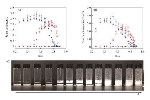 在油相中有無(wú)顆粒條件下的表面張力差如圖6(B)所示。顆粒吸附在表面上會(huì)導(dǎo)致表面張力下降。無(wú)論均勻修飾顆粒還是Janus顆粒,表面張力的下降程度和泡沫體積有一個(gè)最大值。表面張力下降程度的最大值出現(xiàn)時(shí),cosθ大于0.39(θ < 70.1°),而泡沫體積的最大值出現(xiàn)時(shí),cosθ大于0.49(θ < 67.0°)。許多研究人員得到的關(guān)于顆粒穩(wěn)定的泡沫的結(jié)論為:顆粒接觸角等于90°時(shí)泡沫最穩(wěn)定。值得注意的是,在這一結(jié)論中,默認(rèn)顆粒是以單一的、獨(dú)立的形式向界面吸附。如果基于這些理論,在單個(gè)顆粒的接觸角接近90°時(shí),表面張力的下降程度應(yīng)該最大,這與本文研究結(jié)果不符。結(jié)合圖4可見(jiàn),在粗糙表面的親油-疏油狀態(tài)發(fā)生轉(zhuǎn)變(即cosθ_CB跨越0點(diǎn))的cosθ值附近,表面張力下降幅度最大。這對(duì)應(yīng)著顆粒是否向表面吸附與顆粒構(gòu)成的粗糙表面的接觸角θ_CB相關(guān),而不是單個(gè)顆粒表面的接觸角θ,為此本文開(kāi)展了進(jìn)一步研究。