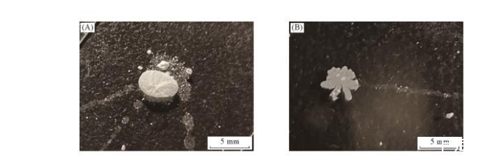 在顆粒參與形成“泡沫”過(guò)程中,存在另外一種現(xiàn)象(見(jiàn)圖8)。在磷酸三甲酚酯溶液中,顆粒附著在液氣表面上,有可能形成氣相為連續(xù)相、液相為非連續(xù)相的狀態(tài)[圖8(A)]。在無(wú)外力作用下,該液滴能夠保持長(zhǎng)時(shí)間穩(wěn)定。如果推動(dòng)液滴,顆粒從氣液表面脫落[圖8(B)],則液滴破碎,留下一層顆粒組成的薄膜。
