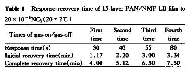 在敏感特性的測試過程中,我們發(fā)現(xiàn)純聚苯胺LB膜對NO?具有較好的敏感性。聚苯胺LB膜的敏感性及響應(yīng)時間與LB膜的層數(shù)有密切關(guān)系。隨層數(shù)的增加,對NO?的響應(yīng)時間逐漸增長,這可以從圖4中看出。