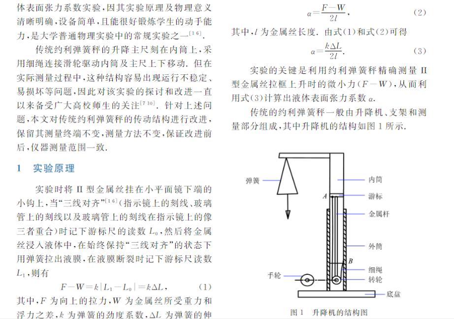 約利彈簧秤是一種精細彈簧秤,常用來測定微小的力。利用約利彈簧秤采用拉脫法測量液體表面張力系數(shù)實驗,因其實驗原理及物理意義清晰明確,設(shè)備簡單,且能很好鍛煉學生的動手能力,是大學普通物理實驗中的常規(guī)實驗之一。