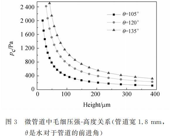 其中,l_i是液體與管道第i條邊接觸線的長度,theta_i是液體對于管道第i條邊的前進角,對于矩形管道有i=1,2,3,4。毛細壓強和管道高度的關系如圖3所示。液體在疏水網(wǎng)表面的流動阻力計算比較復雜,現(xiàn)在有很多的研究文獻,由于這不是本文的研究重點,文中采用了簡化分析,即把柵網(wǎng)作為一個光滑的表面。計算中認為柵網(wǎng)與管道的表面特性相同。