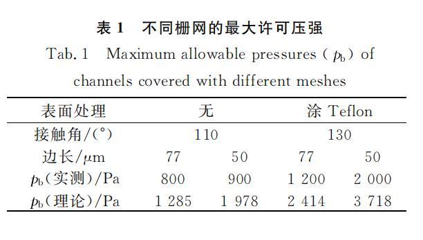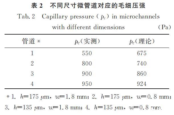 當水流過干燥管道時,表面張力產(chǎn)生的毛細壓強阻礙水的流動,此時的速度-壓強關系如圖8所示。在圖8的每條曲線上都有一個轉折點,且在轉折點之后水的流速迅速增加,轉折處的壓強被作為毛細壓強p。對于這種現(xiàn)象可解釋為在壓強小于毛細壓強的時候,水只能在重力作用下極緩慢流動,由于速度極慢,沿程水頭損失可忽略不計;當壓強大于毛細壓強時,黏性力和壓強差平衡,這時的流速增加較快。毛細壓強Pc的實測值和理論值如表2所示。水對于PDMS和壓敏膠的前進角都是120°,對于Teflon涂膜的柵網(wǎng)接觸角是150°(芬蘭Kibron公司生產(chǎn)的Delta-8全自動高通量表面張力儀)。實驗結果與理論計算一致。