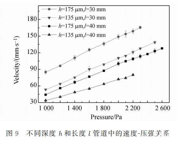 管道中充滿水時的速度-壓強關系如圖9所示。管道截面尺寸主要通過等效水力直徑影響摩擦阻力系數(shù)。由于管道深度遠小于寬度,管道的等效水力直徑取決于管道深度,故這里固定管道寬度而對不同深度的管道進行比較分析。由圖9可知,壓強一定,管道越深,長度越短,對應的流速越大。圖中每條曲線的最大壓強就是測量中每個管道的最大許可壓強,這些壓強值都大于表1中的最大許可壓強實測值。這一方面是由于柵網(wǎng)孔徑分布不均勻,另一方面是由于沿程水頭損失作用,管道中壓強分布沿流動方向減小,導致最大壓強沒有出現(xiàn)在孔徑最大的地方,從而得到的壓強大于靜止狀態(tài)下測得的最大許可壓強。