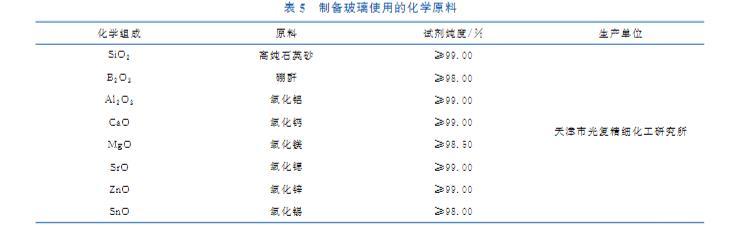 實(shí)驗(yàn)所用的玻璃原料包括石英砂、氧化鋁、硼酐(氧化硼)、氧化鈣、氧化鎂、氧化鍶、氧化鋅,化學(xué)澄清劑所用原料為氧化亞錫,試劑純度等級(jí)均為分析純(AR),實(shí)驗(yàn)設(shè)計(jì)引入成分及使用的原料種類(lèi)、具體純度如表5所示,所有化學(xué)成分均以氧化物原料的形式引入,玻璃成分中除原料可能含有的部分雜質(zhì)以外,均不含任何人為引入的其他成分。