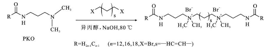 根據前期的工作[2-4]。在圓底燒瓶中,先將0.1 mol連接基化合物,反-1,4-二溴-2-丁烯溶于100 mL異丙醇中。將0.2 mol脂肪酸酰胺丙基二甲胺(PKO-12、PKO-16、PKO-18)加入反應溶液中,并以氫氧化鈉0.4 g作為催化劑加速反應,在80℃下攪拌12 h。反應結束后,用真空蒸發(fā)去除溶劑,得到蠟狀的粗產物。將得到的蠟狀粗品固體在乙酸乙酯/乙醇(20∶1)混合溶劑中重結晶3次,得到白色粉末狀陽離子Gemini表面活性劑。所制備的Gemini表面活性劑(GS-12,GS-16,GS-18)的產率分別為93.5%,92.4%,94.1%。Gemini表面活性劑GS-12,GS-16,GS-18的合成路線如下: