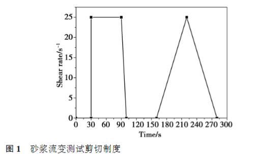 砂漿的流變測試使用Brookfield R/S SST2000流變儀,將測試流動度之后的砂漿立即置于流變儀中,選定設(shè)置好的剪切制度后開始測試,剪切制度設(shè)置如圖1所示。具體過程描述如下:靜置30s后,在剪切速率25s?1下勻速預(yù)剪切60s;然后剪切速率在10s內(nèi)勻速下降至0s?1;靜置60s后,剪切速率以斜坡式在60s內(nèi)逐漸從0s?1提高至25s?1,然后再以斜坡式在60s從25s?1下降到0,采集60個數(shù)據(jù)點(diǎn)。采用剪切速率從25s?1下降到0s?1的過程中的屈服應(yīng)力和表觀黏度作為分析砂漿流變性能的數(shù)據(jù)。