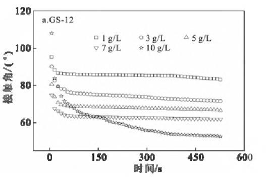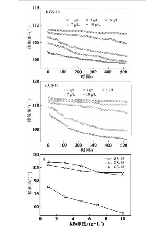 在KBr濃度區(qū)間1~10 g/L內(nèi),GS-12隨著KBr濃度的增加,接觸角顯著減小,而GS-16和GS-18則變化不明顯??梢越忉尀?對于GS-12而言,KBr濃度越高,固/液界面處的填料越緊密,導致氣/液固界面張力值降低,而疏水鏈較長的GS-16和GS-18其自身降低界面張力的能力有限,所以,隨KBr濃度增加,接觸角變化有限[1,19]。此外,隨著KBr濃度的增加,液滴在石蠟膜上的接觸角值減小。