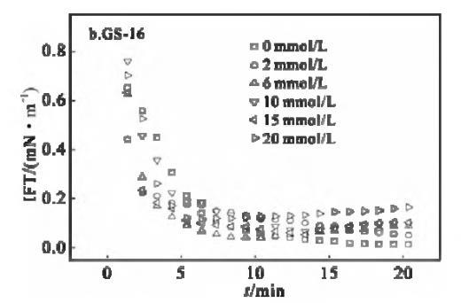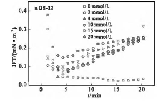表面活性劑/油體系的動態(tài)界面張力行為,對驅油過程具有重要意義。動態(tài)界面張力是驅油過程中各種復雜物理化學反應的具體體現(xiàn)。因此,研究動態(tài)界面增長力及其影響因素非常重要。溶液中離子強度增加,將影響表面活性劑分子在水相中的溶解度,改變雙電層參量,而導致油水界面表面活性劑濃度的改變。一般情況下,添加的鹽可以通過中和表面活性劑分子在界面上頭基的電荷來減弱表面活性劑分子之間的靜電斥力,導致IFT降低[5]。溫度為30℃下,不同KBr鹽濃度下,GS-12,GS-16的煤油/表面活性劑溶液界面張力隨時間的變化曲線見圖6。