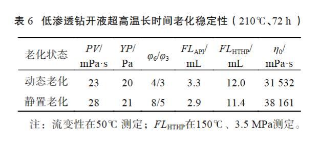 表6低滲透鉆開液超高溫長(zhǎng)時(shí)間老化穩(wěn)定性(210℃、72 h)