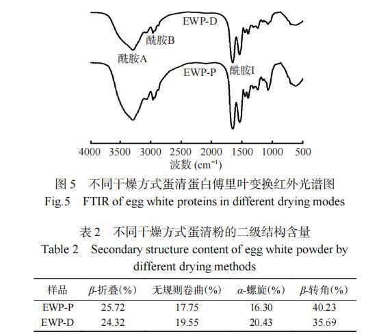 不同干燥方式蛋清蛋白的紅外光譜如圖5所示。EWP-P和EWP-D在酰胺A帶(3700~3200 cm?1)處有強(qiáng)吸收峰,EWP-P的峰強(qiáng)大于EWP-D,表明干燥方式會影響蛋清蛋白的水合能力,這可能與蛋白質(zhì)分子中N-H鍵舒展并與氫鍵形成了締合體,或蛋白質(zhì)分子與葡萄糖以共價(jià)鍵結(jié)合有關(guān)。酰胺B帶(2961.64 cm?1)的弱吸收峰主要由C-N鍵產(chǎn)生。酰胺I帶(1600~1700 cm?1)信號主要由C-O鍵伸縮振動引起,與蛋白質(zhì)的二級結(jié)構(gòu)有關(guān),涉及β-折疊(1600~1640 cm?1)、無規(guī)則卷曲(1640~1650 cm?1)、α-螺旋(1650~1660 cm?1)和β-轉(zhuǎn)角(1660~1700 cm?1)。采用Peak fit軟件對不同干燥方式蛋清蛋白的酰胺I帶峰強(qiáng)進(jìn)行高斯曲線擬合分析,根據(jù)峰面積計(jì)算其二級結(jié)構(gòu)的相對百分含量,結(jié)果如表2。EWP-P和EWP-D的二級結(jié)構(gòu)以β-折疊和β-轉(zhuǎn)角為主,EWP-P的β-折疊含量增加主要與卵轉(zhuǎn)鐵蛋白熱變性有關(guān),同時(shí)分子間的β-折疊結(jié)構(gòu)也易轉(zhuǎn)變?yōu)棣?轉(zhuǎn)角結(jié)構(gòu)。而α-螺旋下降可能是因?yàn)闊嶙冃詫?dǎo)致α-螺旋中的氫鍵斷裂,進(jìn)而發(fā)生了解螺旋現(xiàn)象。EWP-P無規(guī)則卷曲增加,表明其部分有序結(jié)構(gòu)向無規(guī)則卷曲轉(zhuǎn)化,蛋白變性明顯,結(jié)構(gòu)的隨機(jī)性增強(qiáng)。