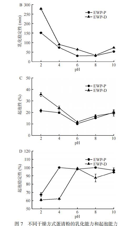 Dabbour等研究向日葵蛋白時也發(fā)現(xiàn)所有的蛋白樣品在pH6.0時的起泡性最低,且冷凍干燥樣品的起泡性優(yōu)于對流烘箱干燥樣品。另一方面,泡沫穩(wěn)定性與蛋白膜的強度有關,蛋白質在攪打時,蛋白質分子被吸附在空氣-水界面,蛋白質分子重新排列,使其疏水部分朝向氣相方向,這種變化容易引起巰基的氧化,在空氣-水界面與相鄰的蛋白質分子中的巰基形成二硫鍵,從而增強界面膜的強度,有利于泡沫穩(wěn)定性。EWP-P的泡沫穩(wěn)定性大于EWP-D,可能是因為噴霧干燥可能導致更多的蛋白質展開,表面游離巰基含量較多。另一方面可能是因為EWP-P發(fā)生了美拉德反應,在空氣-水界面上可以形成的厚的粘彈性美拉德產(chǎn)物層,有利于泡沫穩(wěn)定性的增加。Zeng等研究不同干燥方式對雞皮膠原蛋白多肽時也發(fā)現(xiàn)噴霧干燥使其蛋白樣品的泡沫穩(wěn)定性優(yōu)于冷凍干燥樣品。