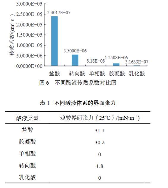 以鹽酸、膠凝酸、轉向酸和乳化酸為對比,測定不同酸液體系傳質系數(shù),實驗結果見圖6。單相酸體系緩速效果最強,比乳化酸體系還下降了一個數(shù)量級,緩速率為99.6%,可以達到緩速深部酸化的效果。單相酸相比于乳化酸酸巖反應速度明顯下降,這與乳化酸粒徑研究結論也是相似的:粒徑越小,酸巖反應速度越慢。