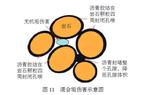 通過觀察傷害后巖心表面,可以發(fā)現(xiàn)瀝青在孔隙系統(tǒng)中的分布模式如圖11所示。對于孔隙系統(tǒng)來說,瀝青膠結在巖石顆粒四周,這類瀝青可能對減小孔隙體積作用不明顯,但其可以顯著限制或封閉孔喉,導致滲透率下降;另一種充填在孔隙內,堵塞整個孔隙,降低孔隙體積。儲層中的瀝青占據(jù)儲層的部分儲集空間,破壞儲層孔隙結構,不僅會減小儲層的孔隙度,同時還會大幅度減低儲層滲透率,嚴重影響儲層物性及油氣井產能。