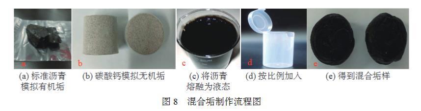 采用瀝青塊模擬有機垢,碳酸鈣(灰?guī)r)模擬無機垢,瀝青和碳酸鈣3∶7混合物模擬混合垢?;旌瞎笜又谱鞑襟E如下:①將瀝青塊敲成小塊放入燒杯;②控溫磁力攪拌器將瀝青融化為液態(tài);③將液態(tài)瀝青趁熱導入塑料試管中;④再按比例加入碳酸鈣,在瀝青凝固前攪拌均勻;⑤得到比表面積接近混合垢(瀝青碳酸鈣質量比為3∶7),混合垢制作流程圖見圖8。