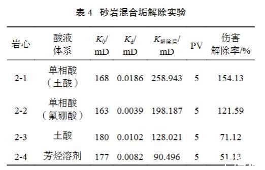 3.單相酸解堵后,巖心滲透率恢復率大于100%,表明單相酸體系不僅可以解除有機垢和無機垢傷害,還能酸蝕增滲,改善近井區(qū)域巖石滲流特性。