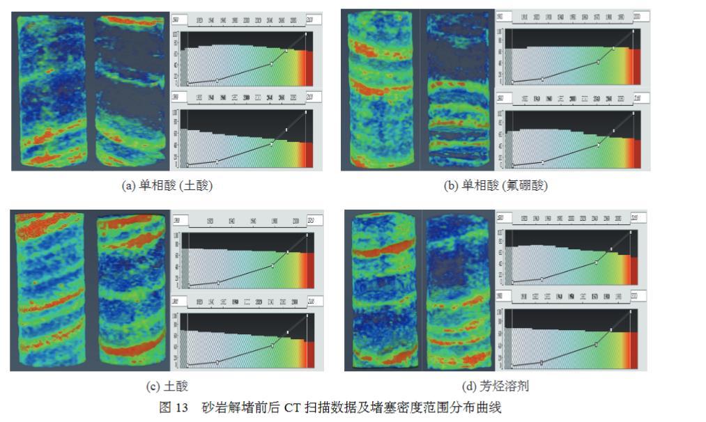 對混合垢傷害解堵前后的巖心進行CT掃描,見圖13。對CT掃描圖像數(shù)據(jù)密度分布進行處理,紅色區(qū)域為以無機質為主的高密度堵塞區(qū)域,藍色范圍為有機質為主的低密度堵塞區(qū)域,圖中可見單相酸(土酸)傷害解除范圍最大,對高密度的礦物溶蝕性能更好。土酸、芳烴溶劑單獨處理效果差。也可從堵塞物CT密度分布曲線得出相同結論(其中,密度分布曲線中橫坐標代表密度數(shù),按照空氣為0,水為1000進行校正;縱坐標為歸一化密度累計占比,對應曲線為混合垢傷害前巖石密度分布,作為參照。密度分布曲線中彩色區(qū)域代表不同密度下CT響應強度),土酸解除了高密度范圍的堵塞,但低密度堵塞沒有解除;芳烴溶劑解除了低密度范圍堵塞,但高密度堵塞沒有解除,而單相酸體系均有解除。