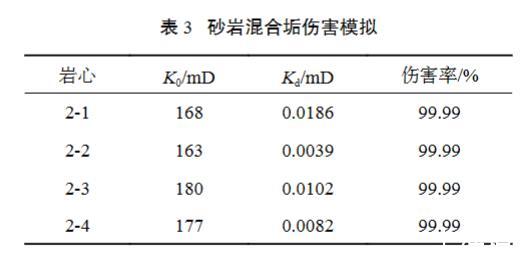 在該實驗方案下,交替注入的碳酸鈉溶液與氯化鈣溶液會在孔隙中形成白色的碳酸鈣沉淀,瀝青飽和進入孔隙中經過正庚烷的揮發(fā)瀝青黏度急劇增加,封堵孔隙造成滲透率下降,可以模擬混合垢傷害砂巖儲層。由表3可見,獲得的砂巖混合垢傷害率大于99%,傷害后巖心滲透率小于0.02 mD,傷害顯著。