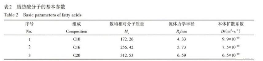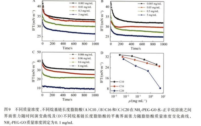 對比不同鏈長脂肪酸在不同質(zhì)量濃度時的動態(tài)界面張力(圖9A-9C),發(fā)現(xiàn)雖然脂肪酸在正辛烷中的擴散系數(shù)隨著碳鏈的增長而減?。ū?),但添加高質(zhì)量濃度C20酸時,界面張力值到達平衡的時間明顯縮短,這表明脂肪酸烷基鏈長度會影響脂肪酸在界面的性質(zhì)。并且發(fā)現(xiàn)脂肪酸烷基鏈越長,與NH2-PEG-GO協(xié)同穩(wěn)定的水-正辛烷界面張力越低。并且隨著脂肪酸質(zhì)量濃度增加,烷基鏈鏈長增加對界面張力降低效果越明顯(圖9D)。