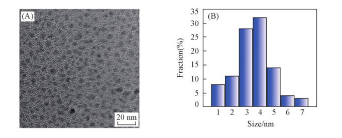 通過(guò)傅里葉變換紅外光譜(FTIR)、透射電子顯微鏡(TEM)和X射線衍射(XRD)對(duì)DA-GQD的結(jié)構(gòu)進(jìn)行表征。從FTIR譜圖(圖S1,見本文支持信息)可知,DA-GQD可能包含C—H,O—H,O═C(R)—和C—N基團(tuán)。從TEM和粒徑分布圖(圖2)可以看出,DA-GQD顆粒比較均勻,基本上為橢球形納米顆粒,粒徑主要分布在1~7 nm,平均粒徑約為3.5 nm。XRD譜圖(圖S2,見本文支持信息)中在20°左右有一個(gè)較寬的峰,說(shuō)明合成的DA-GQD具有石墨烯結(jié)構(gòu)。