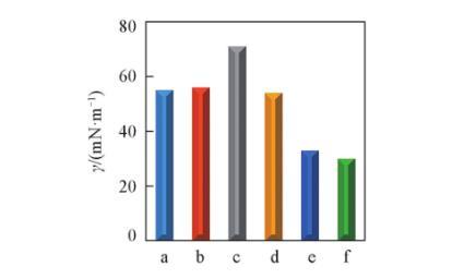圖4對(duì)比了DA-GQD與文獻(xiàn)中常用于穩(wěn)定Pickering乳液的固體顆粒表面活性劑氧化石墨烯(GO)、石墨烯(G)、GQD和氧化亞銅(Cu2O)納米顆粒,以及典型陰離子表面活性劑SDBS的最低表面張力。結(jié)果顯示,GO,G和Cu2O納米顆粒具有較低的水溶性,可以將水的表面張力降低到50~60 mN/m之間,這主要?dú)w因于它們的強(qiáng)疏水性和弱親水性;而且GO和G中的大尺寸石墨烯二維片層容易聚集在流體界面上,增加了界面層的剛性,從而導(dǎo)致其表面活性的進(jìn)一步降低。而只以檸檬酸作為碳源,通過(guò)熱裂解法制備的GQD的表面張力約為71.8 mN/m,接近純水的表面張力。這是因?yàn)镚QD具有極強(qiáng)的親水性和極弱的疏水性,不合適的兩親結(jié)構(gòu)賦予其低的表面活性。此外,SDBS的表面張力為32.4 mN/m,比DA-GQD水溶液略高一些,證實(shí)了DA-GQD的表面活性與SDBS相當(dāng)。