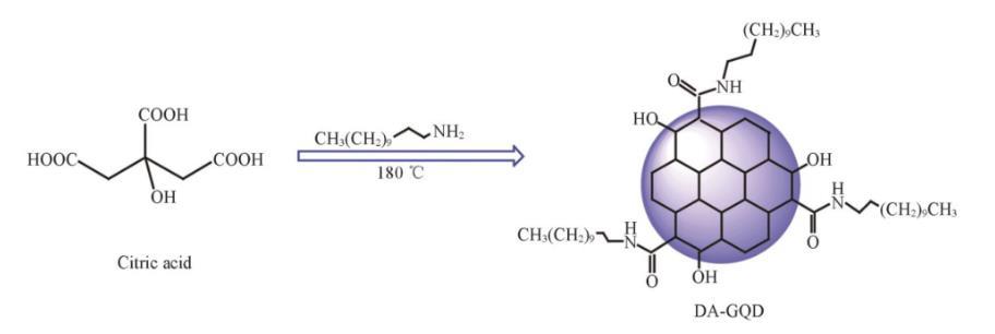 首先采用“自上而下”法,由CX-72炭黑在濃硝酸中回流24 h制備GQD。雖然能夠?qū)崿F(xiàn)一步同時(shí)制備單層和多層GQD,但是存在反應(yīng)時(shí)間長(zhǎng)、強(qiáng)酸會(huì)對(duì)環(huán)境造成一定污染等弊端。本實(shí)驗(yàn)設(shè)計(jì)通過(guò)“自下而上”法,以檸檬酸為前驅(qū)體、直鏈烷基胺為功能化試劑,通過(guò)一步熱裂解制備雙親性DA-GQD(見圖1)。檸檬酸分子之間脫水縮合形成六邊形sp2碳原子鍵合的石墨烯片,十二胺通過(guò)氨基與檸檬酸上的羧基縮合,將烷基鏈引入石墨烯片的邊緣以提高疏水性。