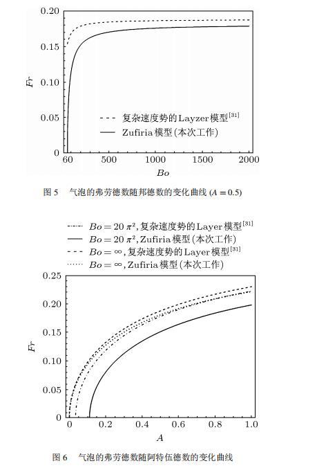 當(dāng)取邦德數(shù)一定時,氣泡的弗勞德數(shù)隨阿特伍德數(shù)的變化如圖3所示。在圖3中Bo=20pi^2。從圖中可以發(fā)現(xiàn),利用Goncharov所提出的復(fù)雜速度勢運(yùn)算的結(jié)果比本次工作稍微大一些。在阿特伍德數(shù)等于1時,兩種理論結(jié)果完全一致。當(dāng)阿特伍德數(shù)較小時,兩種理論結(jié)果也基本一致。