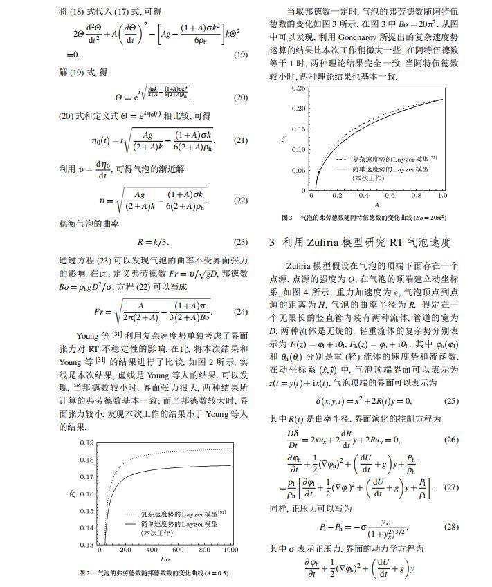 RT不穩(wěn)定性大致可以分為三個階段:早期線性增長階段、非線性增長階段和湍流混合階段。在早期階段,微擾振幅增長率呈指數(shù)增長,這一點(diǎn)人們已經(jīng)達(dá)成共識。當(dāng)微擾振幅和波長可以比擬時,非線性發(fā)生,此時重流體以尖釘?shù)男问皆谳p流體中演化,而輕流體則以氣泡的形式在重流體中上升。在非線性增長的后期,氣泡和尖釘則是以恒定的速度增長。為了描述這一階段的演化,歷史上曾出現(xiàn)兩種主要的理論模型,一種是Layzer模型,另一種是Zufiria模型。1955年Layzer建立了適用于氣泡頂端附近的勢流模型,被稱之為Layzer模型。Zhang后來對該模型的速度勢進(jìn)行了修改。Goncharov、Sohn等人分別提出了新的速度勢,將Layzer模型推廣并應(yīng)用于任意密度比情形。1988年Zufiria提出了另一種理論模型,該模型假想在氣泡的下面存在一個點(diǎn)源,又稱點(diǎn)源模型。Zufiria模型的速度勢是復(fù)數(shù),而Layzer模型的速度勢是實(shí)數(shù)。Zufiria模型的運(yùn)算過程比Layzer模型復(fù)雜。早期Zufiria模型也只適用于無限密度比情形。后來Sohn將其推廣并應(yīng)用于任意密度比情形。