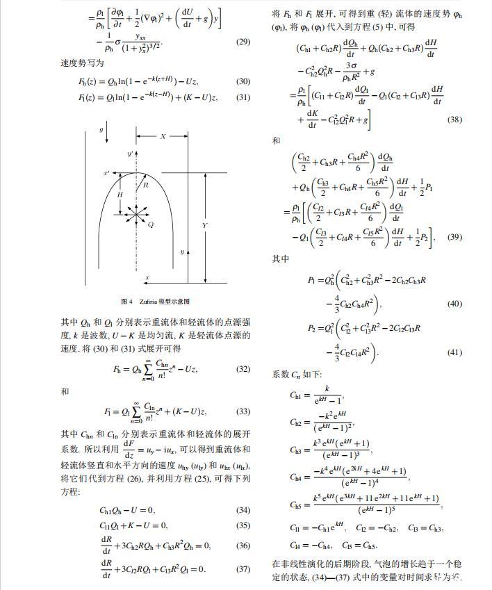 Layzer模型和Zufiria模型都是建立在理想流體之上。然而對實(shí)際流體而言,很多因素都可以影響RT不穩(wěn)定性的演化情況,如密度比、黏性、界面張力、壓縮性、外場加速度、Kelvin-Helmholtz不穩(wěn)定性等。Young和Sohn利用Goncharov提出的復(fù)雜速度勢,將Layzer模型推廣并應(yīng)用到非理想流體中,研究了界面張力對RT不穩(wěn)定性增長的影響,發(fā)現(xiàn)界面張力降低了氣泡的增長速率。2011年本文的作者之一利用Zufiria模型研究了黏性對RT不穩(wěn)定性增長的影響。但是,目前沒有人利用Sohn提出的簡單速度勢的Layzer模型研究界面張力對RT不穩(wěn)定性的影響,也沒有人利用Zufiria模型研究界面張力對RT不穩(wěn)定性的影響。