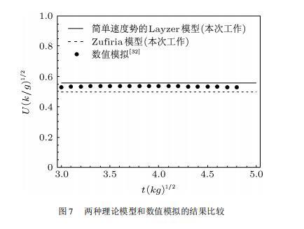 最后,我們將兩種理論模型的結(jié)果與數(shù)值模擬進(jìn)行了比較,如圖7所示。在誤差允許的范圍內(nèi),Zufiria模型和Layzer模型與數(shù)值模擬符合的都很好。由簡單速度勢的Layzer模型得出的結(jié)果更接近于數(shù)值模擬。另外,從圖7中還可以看出,簡單速度勢的Layzer模型計(jì)算值比數(shù)值模擬結(jié)果高,而Zufiria模型比數(shù)值模擬低。這可能由于Zufiria模型假設(shè)速度勢是復(fù)數(shù)勢,會人為引進(jìn)速度的耗散,導(dǎo)致結(jié)果比數(shù)值模擬低,而Layzer模型的計(jì)算值略高于數(shù)值模擬的原因可能由于數(shù)值模擬沒有達(dá)到漸近速度。