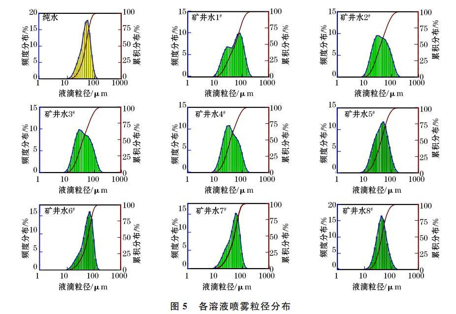 噴霧降塵效果與霧化特性參數(shù)密切相關(guān),其中霧滴粒徑是影響霧化特性的關(guān)鍵因素。9組溶液在15cm測(cè)點(diǎn)處的粒徑分布如圖5所示。由圖5可知,各溶液霧滴粒徑主要分布為25~75μm,純水、礦井水1#至4#和礦井水5#至8#噴霧粒徑位于該區(qū)間的平均比例分別為80.10%、55.87%、69.73%,礦井水1至8#的粒徑累積分布曲線斜率逐漸增加,這說明礦井水霧化效果不斷提升。由此可知,礦井水中Na+、K+離子濃度越低,霧滴粒徑分布越集中,其霧場(chǎng)更有利于呼吸性粉塵捕集。這是由于礦井水表面張力減小,霧滴破碎程度逐漸提高,致使霧滴細(xì)化且粒徑集中分布于25~75μm區(qū)間,這說明噴霧霧化特性隨表面張力減小不斷優(yōu)化,霧滴粒徑趨向均勻分布。綜上,礦井水中Na+、K+離子濃度差異改變其表面張力,從而影響噴霧粒徑分布、霧化百分比等特性。