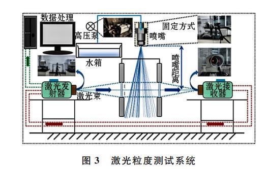 從圖3可知,噴霧粒徑測(cè)試主要儀器及工具包括激光粒度分析儀、高壓噴霧水泵、計(jì)算機(jī)分析控制系統(tǒng)等。計(jì)算機(jī)分析控制系統(tǒng)使用PAQXOS 4.1測(cè)量軟件,該軟件可定義、控制整個(gè)測(cè)量過程,并在試驗(yàn)結(jié)束后處理測(cè)量的粒度分布數(shù)據(jù)。