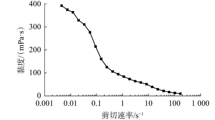 圖7為小段塞的黏度隨剪切速率的變化情況。從圖7可看出,體系黏度隨剪切速率的增加而快速降低,從392.8 mPa·s降至10.3 mPa·s。由于剪切力作用下纏結(jié)的自組裝超分子鏈打開并發(fā)生取向,導(dǎo)致表面活性劑的黏度整體上隨著剪切速率的上升而下降。在低剪切頻率下黏度下降明顯,屬于典型的“非牛頓流體”,但當(dāng)剪切速率進(jìn)一步增大時,黏度下降緩慢。