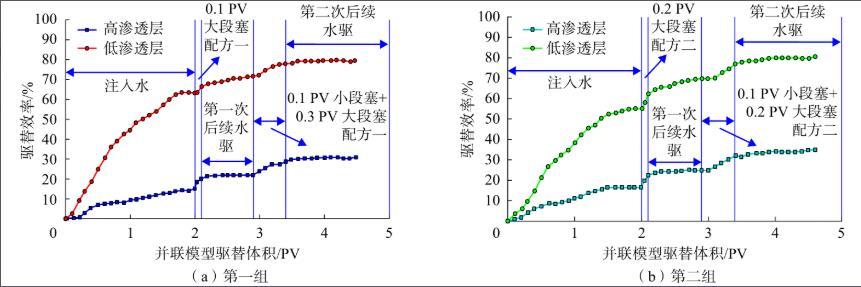 從表1可知,通過并聯(lián)天然巖心表面活性劑驅(qū)油實(shí)驗(yàn)發(fā)現(xiàn),只用大段塞驅(qū)平均提高采收率7.4個百分點(diǎn),非常低。而采用組合段塞進(jìn)行調(diào)和驅(qū),第一組組合段塞驅(qū)在高低滲層分別提高驅(qū)油效率10.1個百分點(diǎn)和17.7個百分點(diǎn)。第二組組合段塞驅(qū)在高低滲層分別提高原油采收率10.2個百分點(diǎn)和16.1個百分點(diǎn),兩組組合段塞驅(qū)平均提高采收率為14.8個百分點(diǎn),比只用大段塞驅(qū)平均采收率提高了1倍,達(dá)到了聚/表二驅(qū)的驅(qū)油效果。