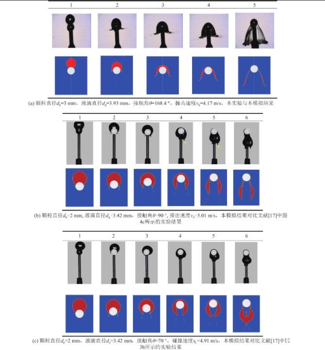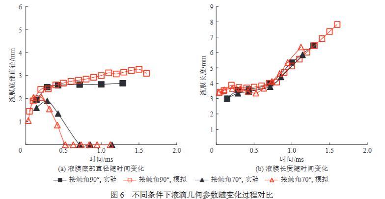 為進一步驗證本模型計算結(jié)果的可靠性,依據(jù)BANITABAEI等在實驗中設(shè)置的不同碰撞條件,開展了相應(yīng)的數(shù)值模擬。如圖5b和圖5c所示,在不同碰撞條件下,數(shù)值模擬結(jié)果中的液滴形變過程與實驗結(jié)果均具有較高的吻合度。圖6對比了數(shù)值模擬結(jié)果與實驗結(jié)果中液滴幾何尺寸的變化過程,也具有較高的吻合度。其中,圖6a所展示的液膜底部直徑隨時間變化曲線,數(shù)值模擬結(jié)果與實驗結(jié)果稍有偏差,原因是實驗中固定顆粒的支撐柱對液膜底部的形變過程產(chǎn)生了一定影響。綜上所述,可認為筆者構(gòu)建的數(shù)值模擬模型合理,結(jié)果具有較高可靠性。由于在毫米尺度下和微米尺度下,液滴與固體顆粒的碰撞過程均遵守經(jīng)典牛頓力學(xué)定律和經(jīng)典流體力學(xué)理論,所以本數(shù)值模擬模型可用于微米尺度下的其他工況條件的數(shù)值模擬研究。
