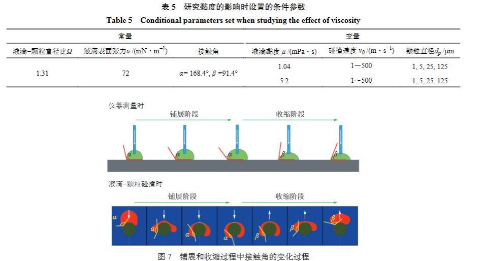 由于碰撞速度、粒徑和液滴黏度均會對液滴與顆粒的碰撞行為產(chǎn)生明顯影響,筆者針對這幾個因素設(shè)置了不同的數(shù)值模擬工況。具體工況參數(shù)見表5所示,其中液滴鋪展過程中的前進接觸角為α;液滴收縮過程中的后退接觸角為β。利用數(shù)值模擬軟件的自動保存功能,對碰撞行為發(fā)展過程中不同時刻的模擬數(shù)據(jù)進行了保存。如圖7所示,當(dāng)液滴在顆粒表面鋪展時,在迭代過程中將接觸角值設(shè)置為α。在液滴在顆粒表面的鋪展過程轉(zhuǎn)變?yōu)槭湛s過程的時刻,將接觸角數(shù)值由α改為β,再進行后續(xù)的迭代計算。