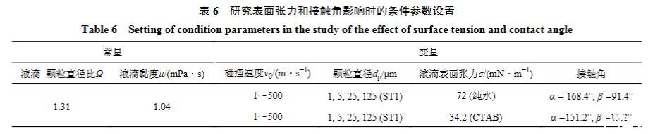 為了進一步確定液滴潤濕特性對液體附著比例的影響,筆者以碰撞速度、顆粒直徑和液滴表面張力(72 mN/m,34.2 mN/m)3個參數(shù)為自變量設(shè)置了不同的數(shù)值模擬條件,具體取值見表6。