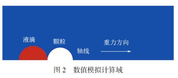 如圖2所示,液滴與顆粒對心碰撞時,流場在演變過程將始終保持軸對稱狀態(tài),因此設(shè)置了二維軸對稱計算域。在相同的網(wǎng)格數(shù)量條件下,二維軸對稱計算域相較于三維計算域具有更好的網(wǎng)格質(zhì)量和計算精度。在分析計算結(jié)果時,可以通過鏡像操作得到中軸線截面上的整體流場圖像。由于實驗中最大雷諾數(shù)的數(shù)量級為104,因此,依據(jù)PASANDIDEH-FARD等的研究結(jié)果,可認為在塵?霧碰撞過程中流場處于層流狀態(tài)。