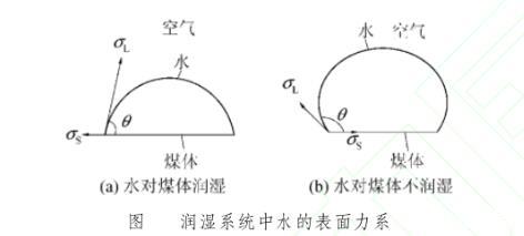 式中,θ為水與煤表面的接觸角,它是指在固、液、氣三相交界處,自固-液界面經(jīng)液體內(nèi)部而到液-氣界面的夾角。如果接觸角θ<90°屬可濕潤煤體,在相同的水表面張力系數(shù)條件下,θ角愈小,毛細(xì)作用力則愈大,增強(qiáng)了注水動(dòng)力,潤濕能力愈大;若濕潤邊角θ>90°屬于不可濕潤煤體,θ角愈大,潤濕能力愈小。