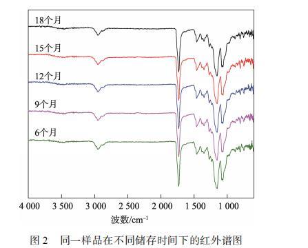 為了探究表面轉(zhuǎn)移涂層是否發(fā)生了結(jié)構(gòu)變化,對(duì)不同儲(chǔ)存時(shí)間下的樣品進(jìn)行紅外光譜測(cè)試分析,見(jiàn)圖2。可以看出,儲(chǔ)存時(shí)間為6—18個(gè)月的樣品的紅外譜圖并未發(fā)生明顯變化。譜圖的一致性證明了噴鋁紙表面轉(zhuǎn)移涂層的基本結(jié)構(gòu)并未隨著時(shí)間發(fā)生明顯變化,即掉墨現(xiàn)象的出現(xiàn)并非由于轉(zhuǎn)移涂層出現(xiàn)結(jié)構(gòu)變化導(dǎo)致。根據(jù)相關(guān)研究,噴鋁紙?jiān)趦?chǔ)存的時(shí)候,紙張及涂層中添加的助劑,環(huán)境介質(zhì)中的水分子、油污和空氣等小分子物質(zhì)會(huì)通過(guò)吸附、擴(kuò)散、遷移和凝集等作用,甚至鍵合等途徑,在轉(zhuǎn)移涂層表面形成低分子物質(zhì)的富集區(qū),即弱界面層,降低了轉(zhuǎn)移涂層的表面張力,并使其印刷適性變差。
