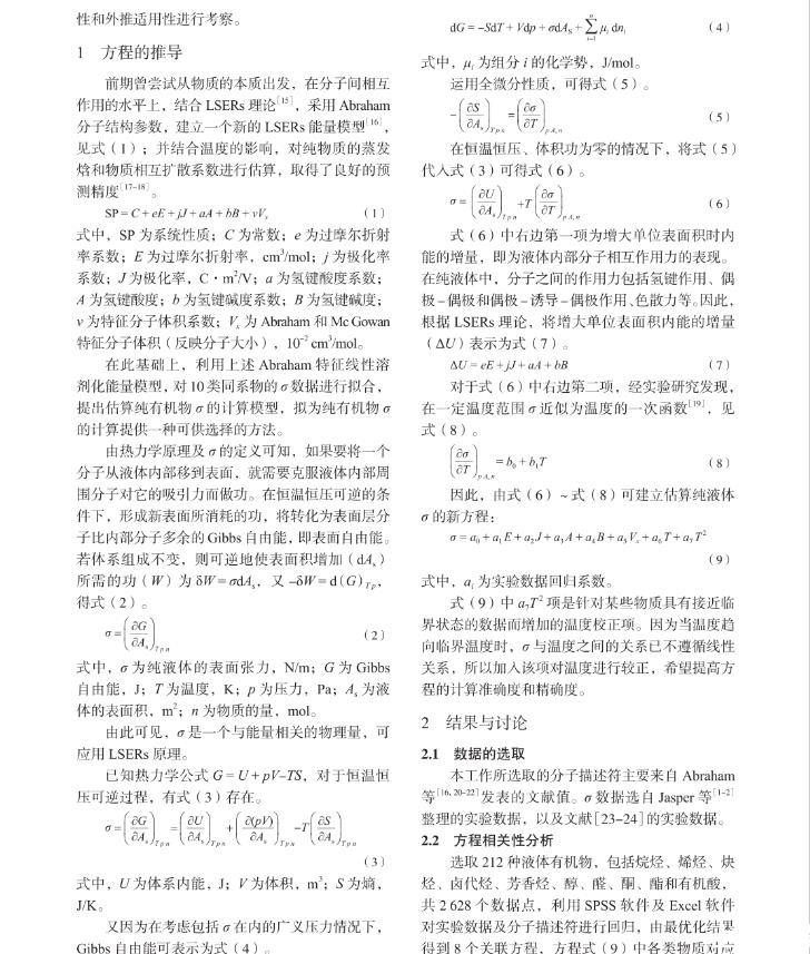 本工作提出一種將σ這一宏觀物性與微觀分子間作用力相關(guān)聯(lián)的一種新的計算方法。根據(jù)線性溶劑化能量關(guān)系(LSERs)理論和經(jīng)驗方程,提出了在不同溫度下估算純有機物σ的關(guān)聯(lián)式。利用所得關(guān)聯(lián)式對2 628個純組分體系中的10個同系物進行了回歸,得到了σ的關(guān)聯(lián)方程,并對方程的相關(guān)性和外推適用性進行考察。