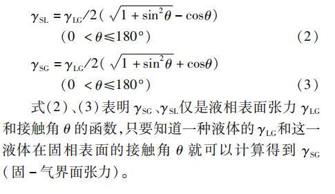 式(2)、(3)表明γSG、γSL僅是液相表面張力γLG和接觸角θ的函數(shù),只要知道一種液體的γLG和這一液體在固相表面的接觸角θ就可以計算得到γSG(固-氣界面張力)。