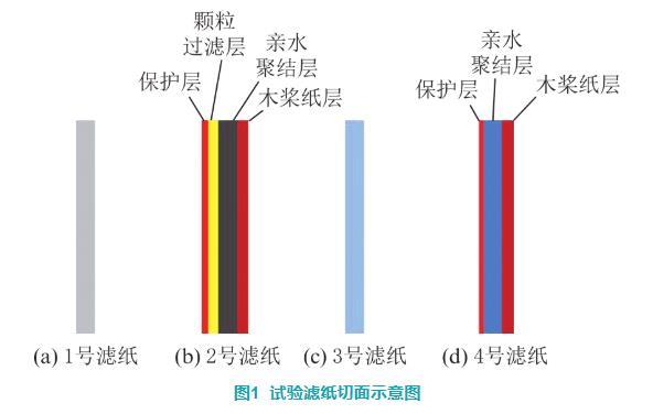 濾紙的切面結(jié)構(gòu)如圖1所示。1號(hào)濾紙為單層親水材料。2號(hào)濾紙由保護(hù)層a、顆粒過(guò)濾層b、親水聚結(jié)層c和木漿紙層d組成,木漿紙作為基層材料,c和d層、b與c層均由樹脂粘結(jié),a與b層通過(guò)超聲波焊接在一起。3號(hào)濾紙為聚四氟乙烯編織而成的單層網(wǎng)狀濾紙。4號(hào)濾紙由保護(hù)層a、疏水過(guò)濾層b和基層c組成,4號(hào)濾紙的粘結(jié)工藝與2號(hào)濾紙相同,保護(hù)層和疏水層由超聲波焊接在一起,基層和疏水層使用樹脂進(jìn)行粘結(jié)。