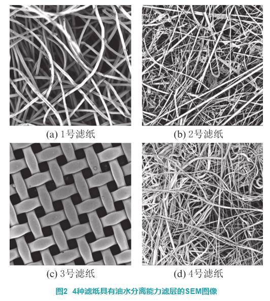 使用Phonem Pro X掃描電子顯微鏡(scanning electron microscope,SEM)在500倍放大倍率下拍攝的4種濾紙的微觀結(jié)構(gòu)如圖2所示。1號(hào)濾紙由直徑約為15μm的親水纖維構(gòu)成;2號(hào)濾紙的親水層由粗細(xì)不同的纖維通過(guò)樹脂粘接而成,其中粗纖維還起到增加親水層物理強(qiáng)度的作用;3號(hào)濾紙由直徑約為45μm的聚四氟乙烯纖維絲編制,兩根纖維之間的距離約為44μm;4號(hào)濾紙的b層由疏水材料通過(guò)熔噴工藝制成,在平面上纖維分布疏密不均但在空間內(nèi)有著較好的孔隙分布。除了3號(hào)濾紙外,其余濾紙均具有油水分離層,同時(shí)也具有較為復(fù)雜的空間結(jié)構(gòu)。